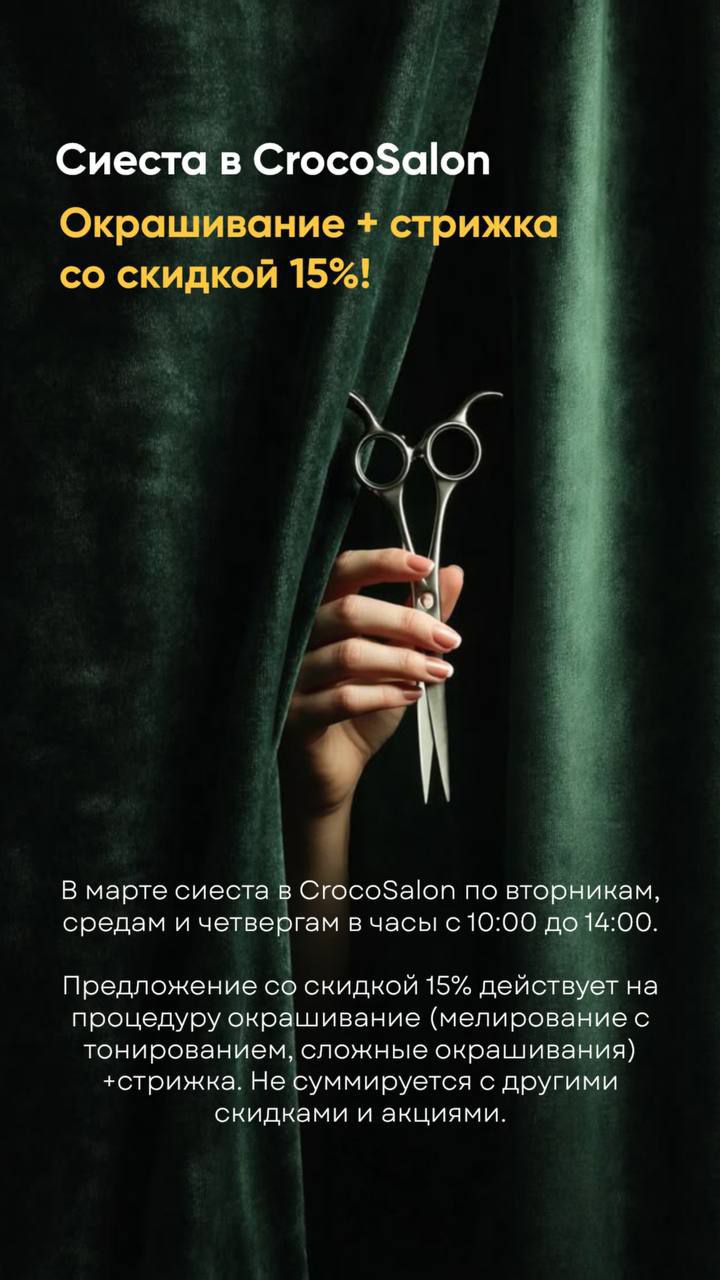 🔔В марте сиеста в CrocoSalon по вторникам, средам и четвергам в часы с 10:00 до 14:00.🔔